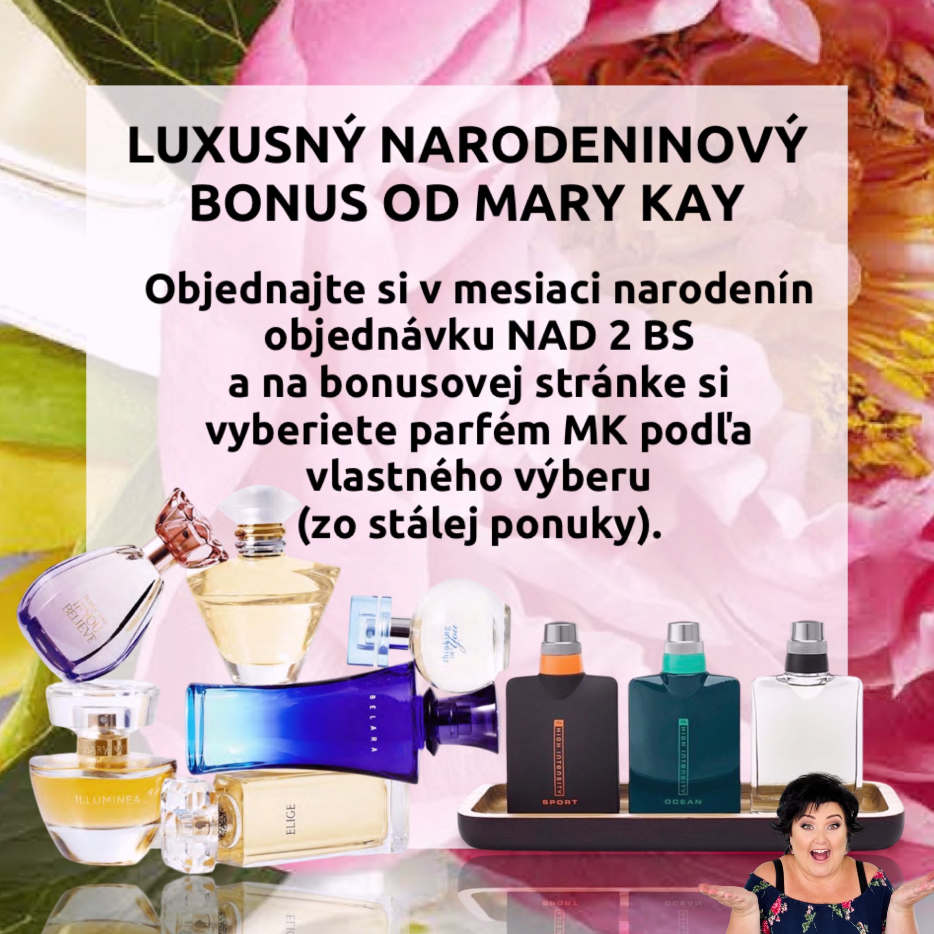 V mesiaci Vašich narodenín má Mary Kay pre Vás výnimočný a hodnotný darček - narodeninový bonus - parfém podľa vlastného výberu (zo stálej ponuky). Stačí objednávka nad 2bs najneskôr v deň uzávierky.